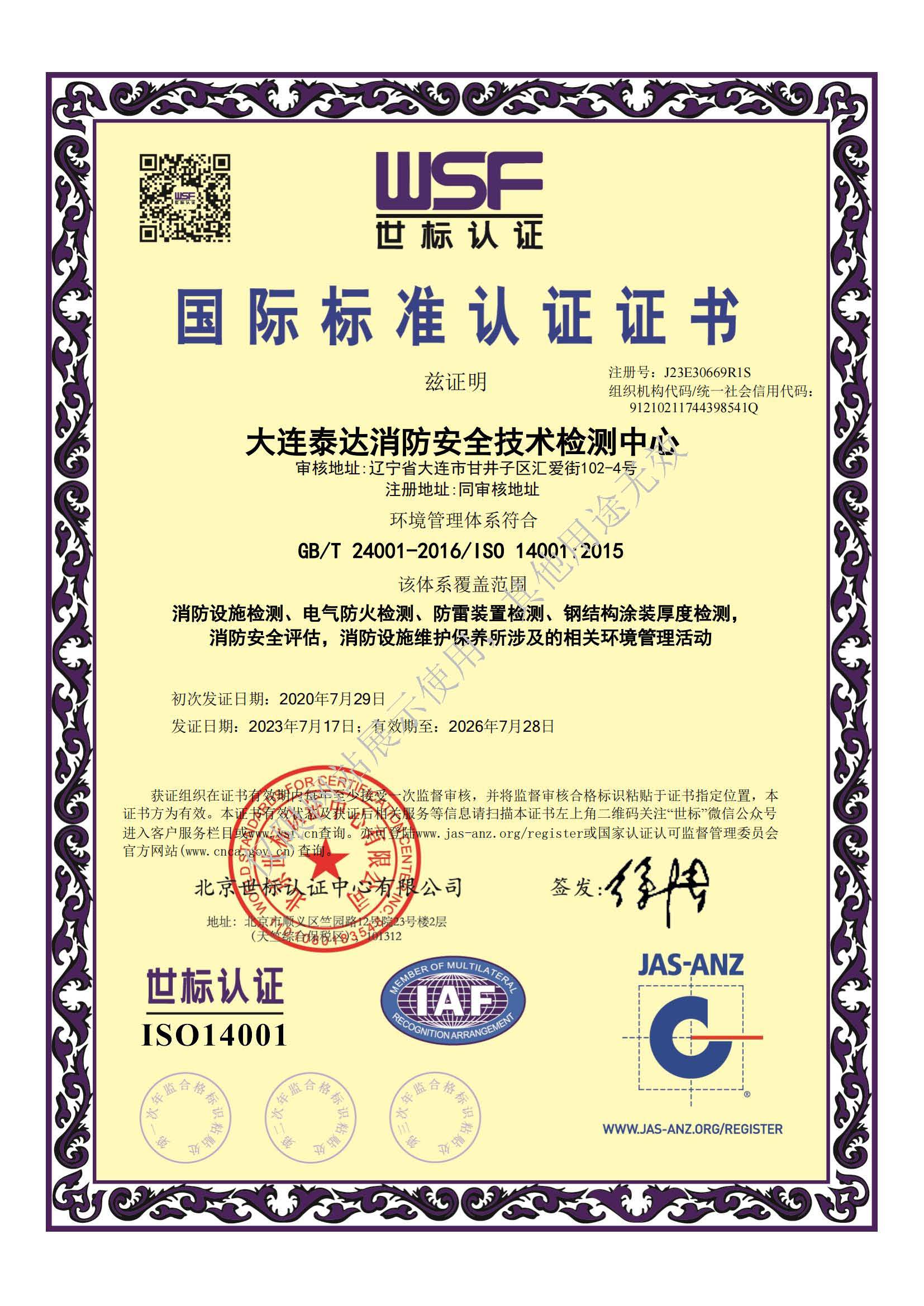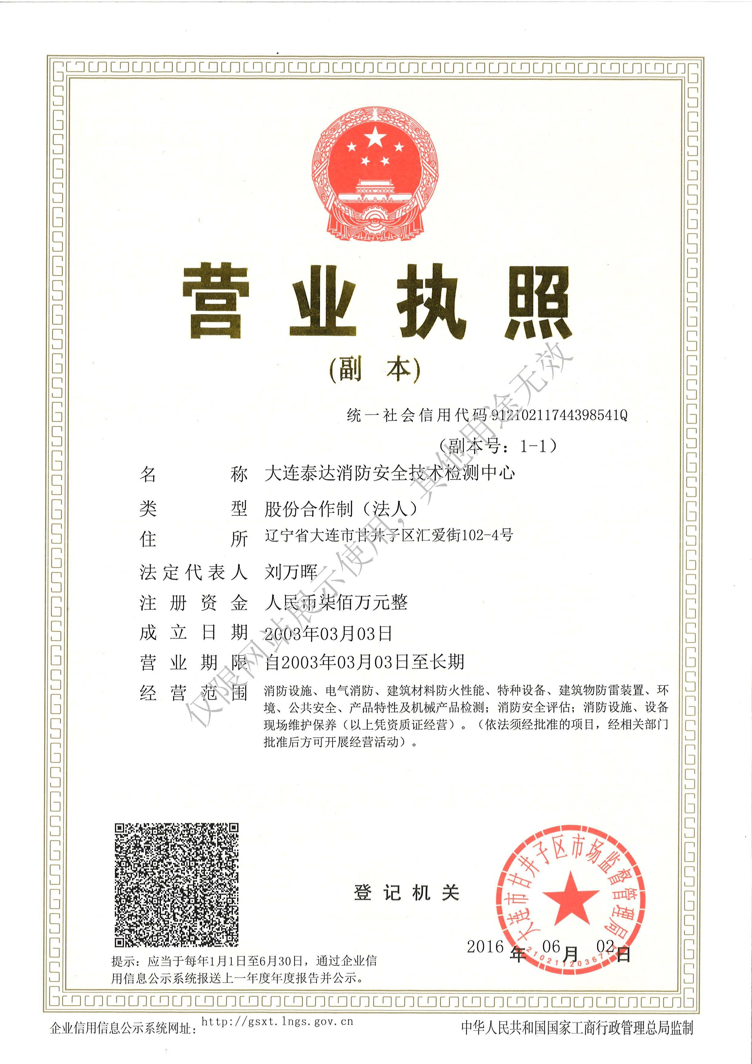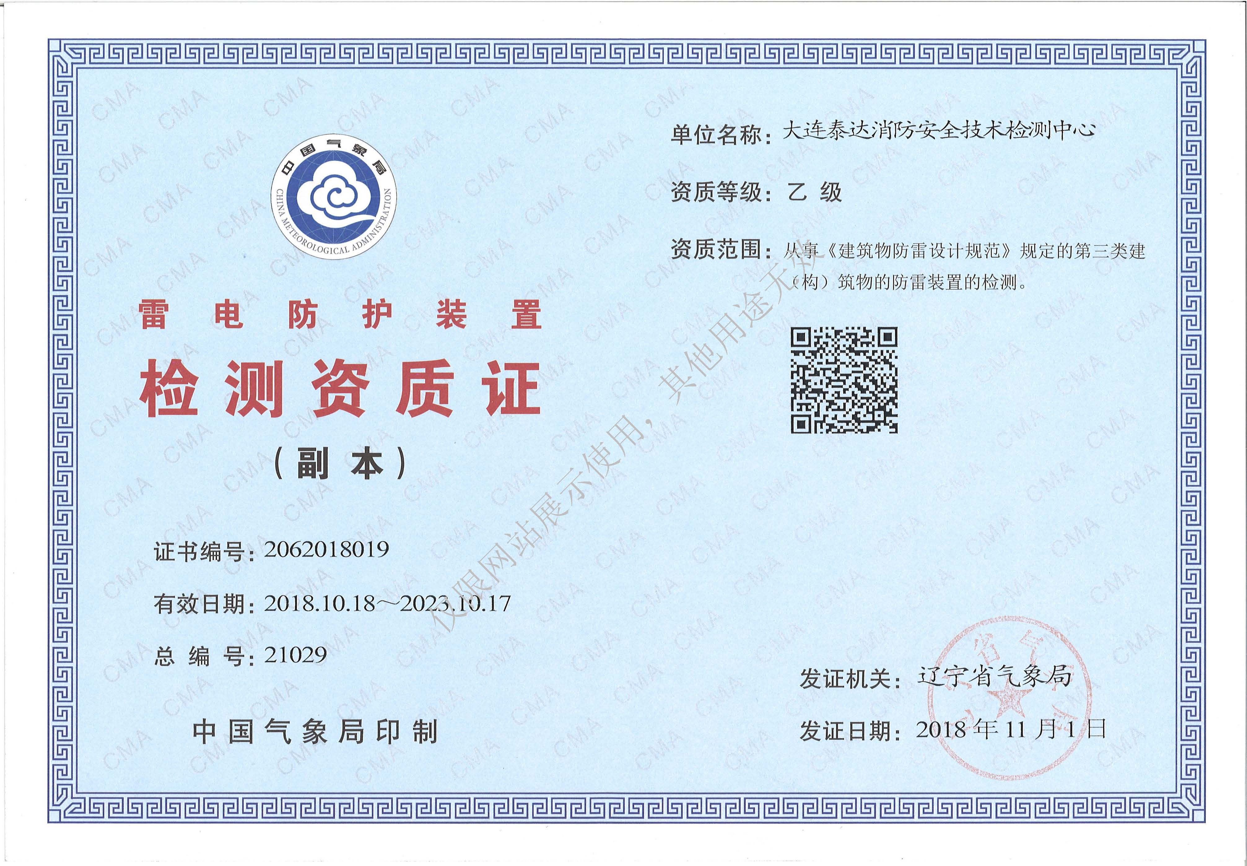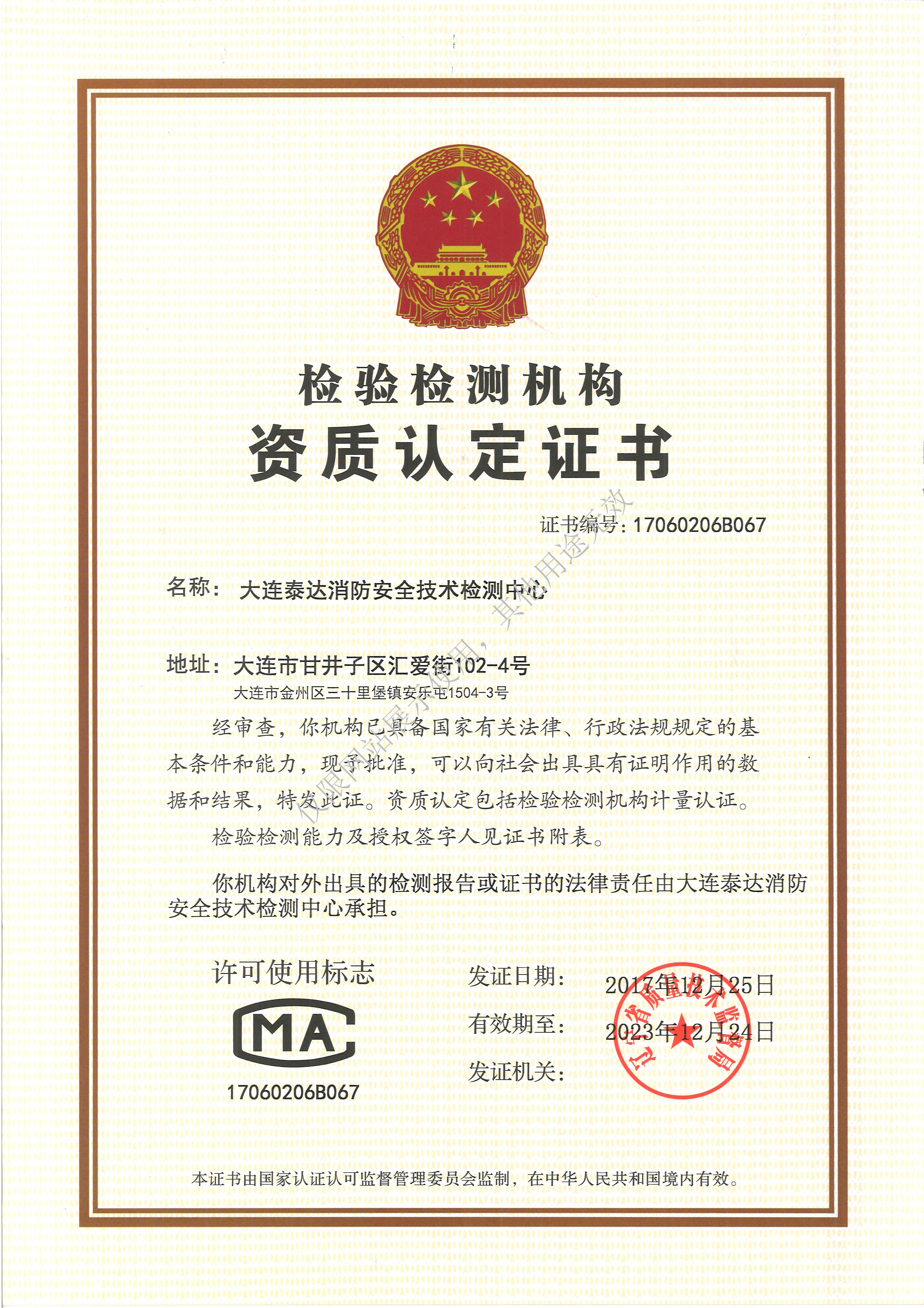 · 是經(jīng)“社會消防技術服務信息系統(tǒng)”備案并公示的消防技術服務機構,已取得中國氣象局頒發(fā)的雷電防護裝置檢測資質證書、遼寧省質量技術監(jiān)督局審核批準的檢驗檢測機構資質認定證書(CMA)及包括消防檢測、電氣檢測、雷電防護裝置檢測、防火涂層厚度檢測等在內(nèi)的200余項檢驗檢測能力,取得大連市應急管理局頒發(fā)的安全生產(chǎn)標準化證書,獲得質量管理體系、環(huán)境管理體系、職業(yè)健康安全管理體系認證證書,是經(jīng)備案的高新技術企業(yè),可獨立出具具有證明作用的檢測報告。